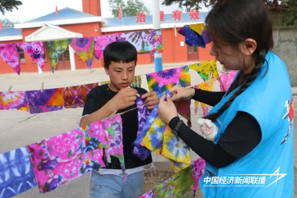 实践队还开设了特色扎染课,悉心教授孩子们动手完成折叠、绑扎、浸泡、染色等扎染环节,让孩子们对扎染工艺的来源、材料、手法等知识有了初步了解,在欣赏和制作的过程中不断探索和体验非遗技艺的独特魅力。