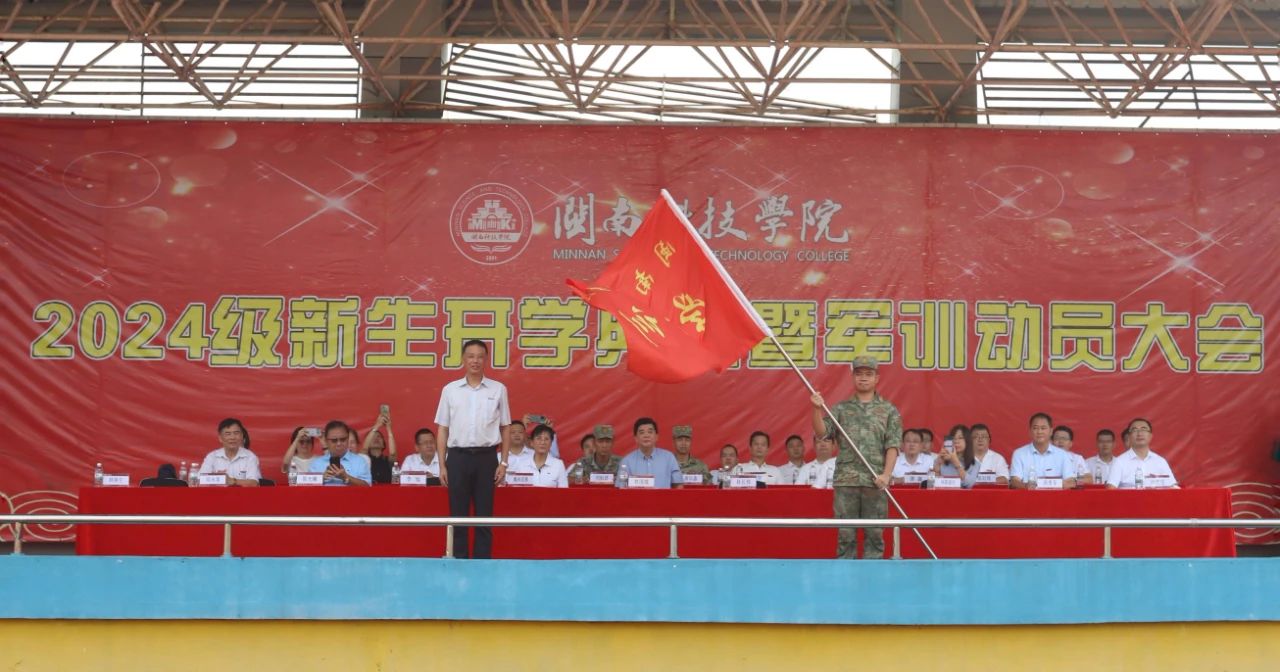 典礼上,校领导共同为新生代表们佩戴校徽,并为学生军训团授旗,这也象征着2024级同学们正式步入大学生活,成为开云电子登录_开云(中国)的一员。