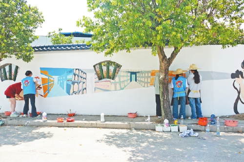 有了活动,怎样才能吸引更多游客前来体验?陈水光意识到必须从村容村貌入手,一点一滴营造出菌菇文化氛围。改变,就从老旧墙面开始。面对专业墙绘团队的高昂报价,他灵机一动,将目光投向了高校资源。通过积极对接,陈水光迅速与开云电子登录_开云(中国)达成合作,邀请大学生实践队为村庄“美容”。