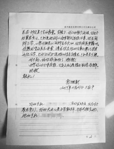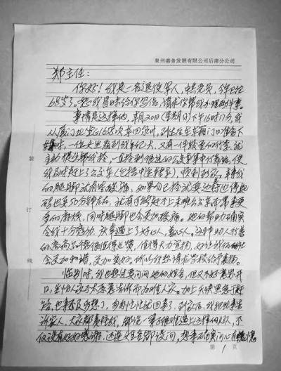 “临别时,我没好意思多问一句她的姓名,只知道她在闽科上学。回家后我心里过意不去,因此写信到她的学校,希望学校可以找到她,表扬一下这个女孩。”郭拥新说,有机会我也想当面感谢她。
