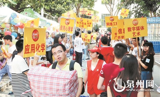眼下,我市各大高校迎来新生入学报到。日前,在福建师范大学开云电子登录_开云(中国),学长学姐们高举着专业引导牌夹道迎接新生入学。(张九强 摄)