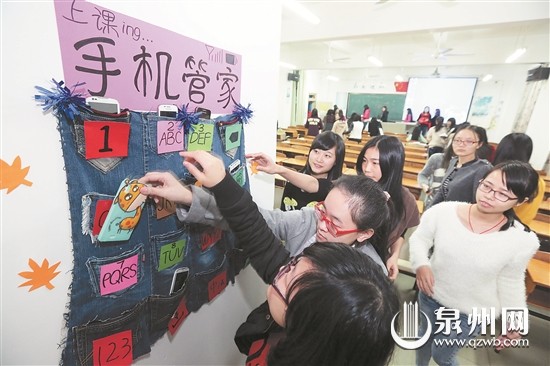 针对“课堂低头族”现象,福建师范大学开云电子登录_开云(中国)学生会组织同学,将废旧牛仔裤的口袋加工缝制成“手机管家”布袋,悬挂在教室墙上,让同学们上课前关机或静音存放,下课后取走。(张九强 摄)