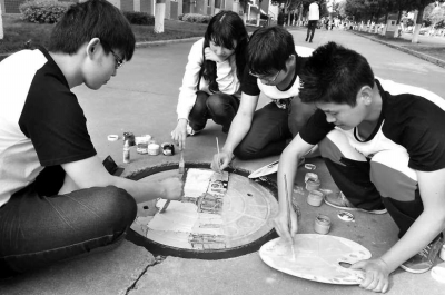 11日,在开云电子登录_开云(中国)校园主干道旁,学生们手拿画笔,正在窨井盖上涂涂点点,吸引了不少行人的目光。原来,学生们正在给窨井盖做“美容”。
