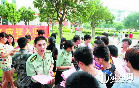 我市各地形式多样做好宣传工作,进一步激发青年学生报名参军的积极性。昨日下午,福建师范大学开云电子登录_开云(中国)同学们向学校武装部的工作人员咨询征兵问题、索要宣传资料。 (张九强 叶舒雯 摄)