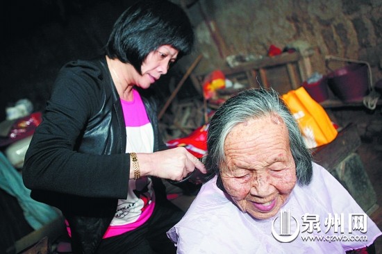 “来,头低一点,我帮你把头发剪短一点,夏天才不会热哦。”昨天上午,在南安市康美镇康美村一座年久失修的古厝里,助老志愿者蔡明惠女士给94岁的空巢老人陈金瑜阿婆理头发。