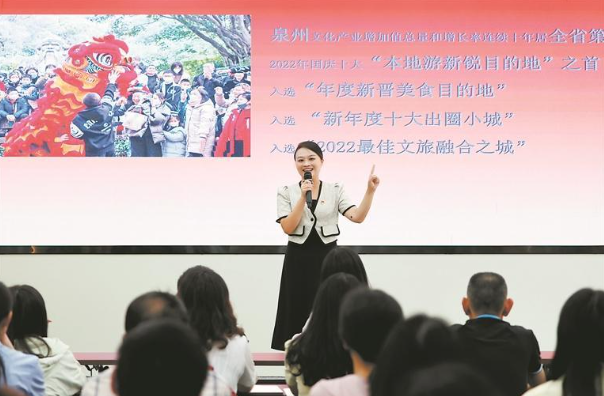 “年初在南安侨胞之家,一位老华侨告诉我,他回到家乡,看到家乡发展得这么好,他没有什么遗憾,唯一的心愿就是吃一碗面线糊。他就带着孩子们一起去吃,吃到第一口眼泪就掉下来了,一边吃一边哭。这就是家的味道吧,听到老华侨这么说,当时我的眼泪忍不住掉下来。”中共泉州市委讲师团理论调研室主任童婷香在宣讲中说,泉州人心心念念的是家乡,作为一名生活在世遗之城的泉州青年,正为建设21世纪“海丝名城”贡献青春力量,“泉州青年把‘福兔’打造成春节‘顶流’,引领蟳埔文化惊艳出彩,他们创新青年文艺、青年文创、青年涂鸦等方式,把最古老的文化基因,赋予最新潮的传承,融入最现代的生活。”