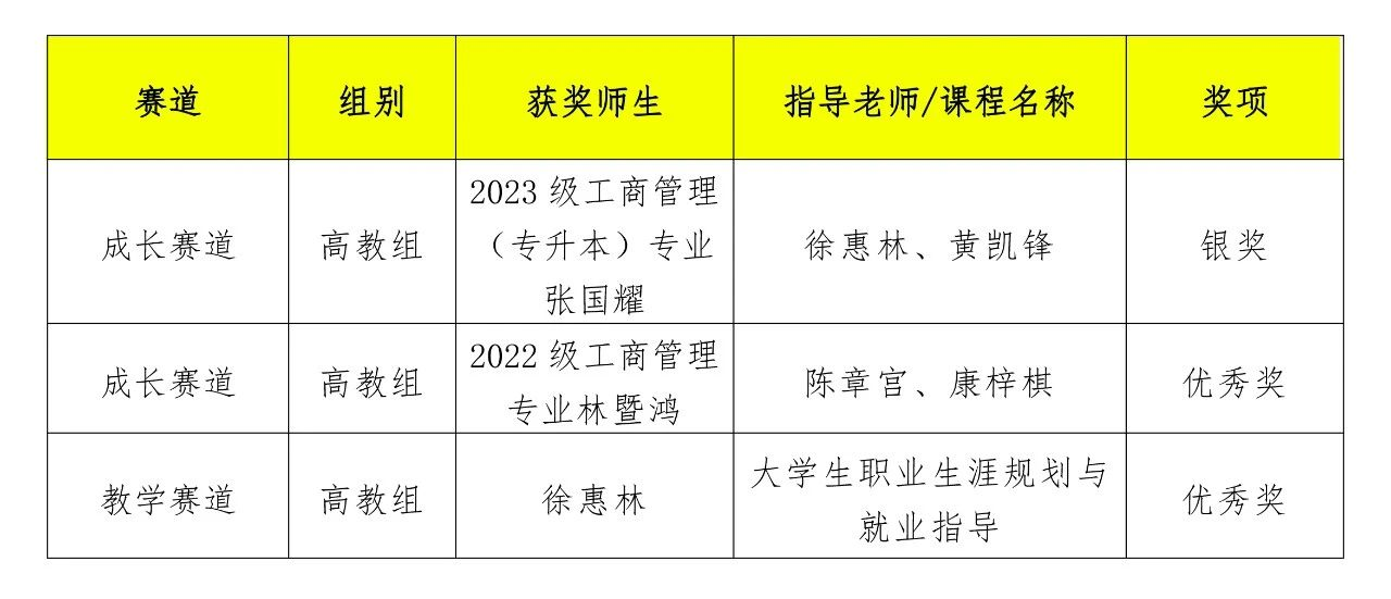 近日,由福建省教育厅主办的第十六届福建省大学生职业规划大赛决赛在华侨大学举办。经过高校推荐、省赛网评和现场决赛,我校商学院2023级工商管理(专升本)专业张国耀(指导老师:徐惠林、黄凯锋)、2022级工商管理专业林暨鸿(指导老师:陈章宫、康梓棋)在成长赛道(高教组)中分别获得银奖、优秀奖,徐惠林老师的《大学生职业生涯规划与就业指导》课程在教学赛道(高教组)获得优秀奖。