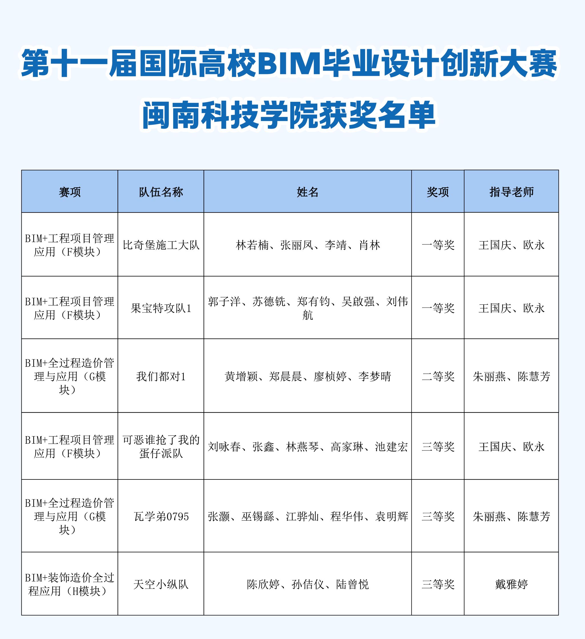 我校积极响应大赛号召,土木工程学院精心组织校内海选赛和校园赛,选拔出优秀团队参加全国总决赛,在国际高校 BIM 毕业设计创新大赛中展现闽科学子“敢拼会赢”的精神风貌,体现土木工程学院专业人才培养的质量与水平。