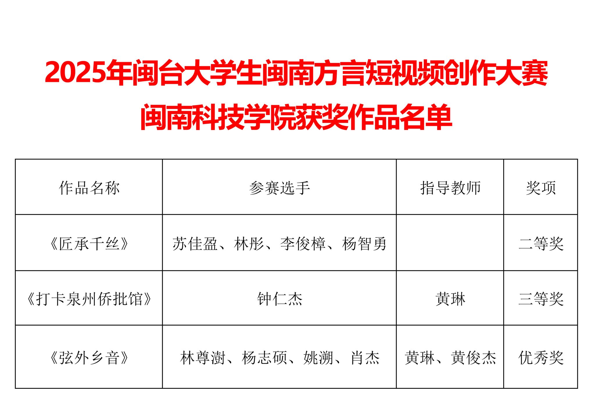 近日,2025年闽台大学生闽南方言短视频创作大赛公布获奖名单,我校艺术设计学院学子获得二等奖1项、三等奖1项、优秀奖1项。
