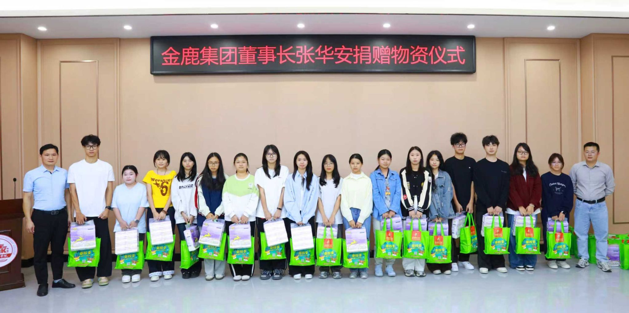 10月23日,金鹿集团董事长张华安带队到学校,捐赠金鹿集团生产的日常生活物资,商学院80名学生接受捐赠。校长袁自煌、校党委书记李旭会见张华安董事长一行。