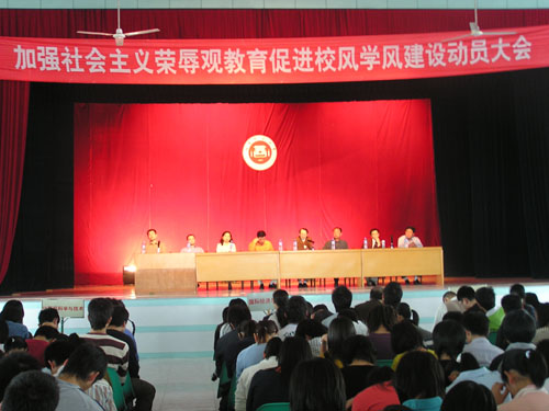 为与党中央路线保持一致,4月19日,学院召开加强社会主义荣辱观教育促进校风学风建设动员大会,院领导、学院法人代表戴宽南先生及全院师生参加了大会。黄国盛院长在会上作了关于“八荣八耻”和校风学风建设的报告。戴宽南先生代表董事会在会上发表关于荣辱观教育及校园建设情况的讲话,宣布了2006年下半年开云电子登录_开云(中国)将隆重举行5周年校庆。最后,戴宽南先生希望同学们努力学习,将来成为社会主义建设有用的人才。黄国盛院长的报告及戴宽南先生的讲话使师生们受到深刻的教育和极大的鼓舞。
