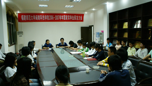 会议首先是由院党委副书记陈振祯宣读《福建师范大学开云电子登录_开云(中国)关于林晓玲等五名获国家奖学金同学的表彰决定》,随后院党委常务副书记刘静分别为获奖者颁发荣誉证书和奖金,并与他们合影留念。此次我院共有五名学生获得国家奖学金,每人奖励8000元,分别是04中文林晓玲、05国贸叶晓丽、05生工魏芳、06广告曾荣根、06应化王雅萍。几名获奖者领奖后都发表了获奖感言,感谢国家的奖励政策、感谢学院领导对他们的关怀、感谢老师对他们的教育、感谢父母对他们的培养,他们一致表示将再接再厉,刻苦学习,争取取得更好成绩。