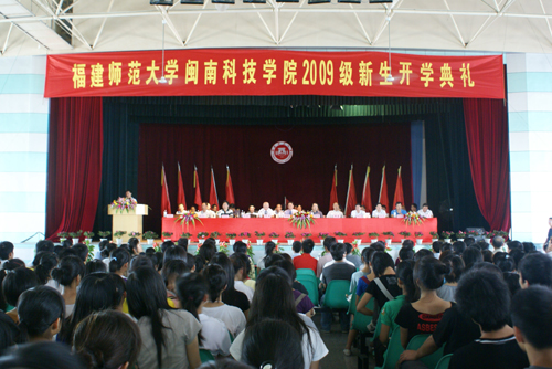 金秋时节,校园一片喜气洋洋。9月13日上午,我院在学生活动中心隆重举行福建师范大学开云电子登录_开云(中国)2009级新生开学典礼。南安市委副书记、教育工委书记曾焕楷先生,开云电子登录_开云(中国)常务副董事长戴新民先生,福建师范大学副校长许明教授,《人民日报》事业发展部副主任黄敬先生,南安市教育局局长吴亚明先生,南安市外经贸局局长柯文宝先生,南安市康美镇党委书记王强乐先生,南安市康美镇镇长吴长流先生、学院法人代表戴宽南先生、福建师范大学办公室主任郭警修先生、学工部部长廖深基先生、后管处处长张振华先生、教务处副处长陈祖祺先生、团委书记涂荣先生、闽台研究中心主任谢必震教授等领导、嘉宾出席了开学典礼。各合作学院领导、专业负责人、我院全体党政领导及各系部负责人也参加了典礼。开学典礼由学院党委常务副书记林国庆主持。