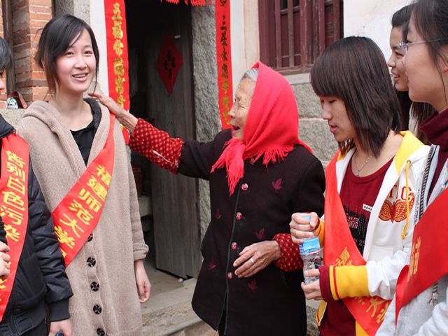 同时,同学们走访当地老妇人,给她们送去慰问品并帮忙打扫卫生。“情系基层当先锋 如火青春为海西”,09级教育技术学专业同学积极响应学院开展的“百团创优当先锋 高举团旗跟党走”的团支部立项活动,在提高自身实践能力的同时,为海西建设贡献出了一份力量。