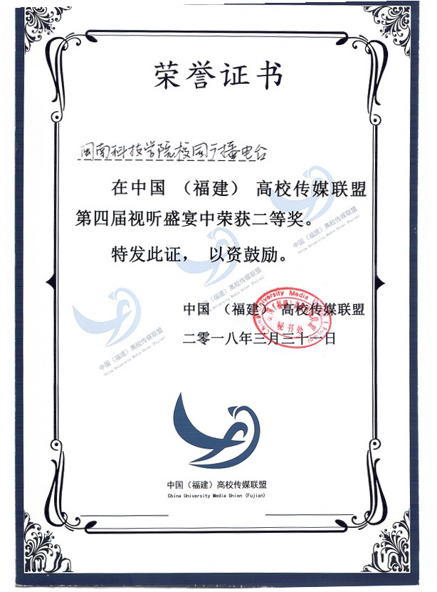 3月31日,2018中国(福建)高校传媒联盟第十届年度峰会召开,在颁奖仪式上,我院校园广播电台选送作品《疯狂动物城》影视片段配音(配音:陈启荣,黄嘉静,林家晟,姚晨心,剪辑:石冬明)获第四届“视听盛宴”二等奖和最佳人气奖,《开云电子登录_开云(中国)报》报社获评2017-2018“十佳校媒”年度评选“年度潜力校媒单位”。