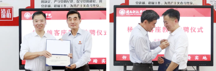 敦聘仪式上,游小波校长为杨良雄教授颁发聘书、佩戴校徽。