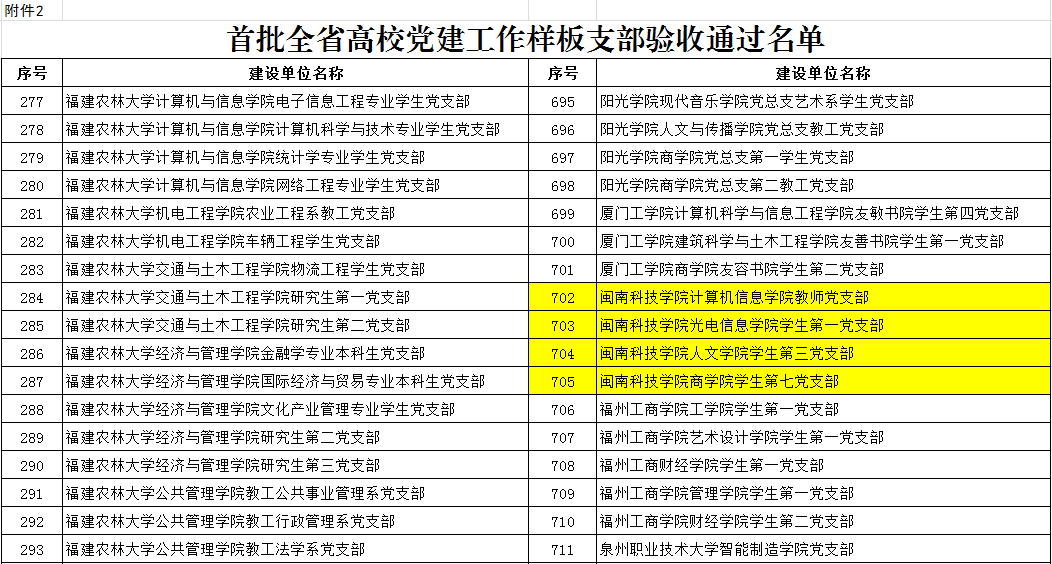 近日,中共福建省委教育工作委员会公布首批全省高校党建工作标杆院系、样板支部验收通过名单,我校生命科学与化学学院党总支通过“全省党建工作标杆院系”建设单位验收,计算机信息学院教师党支部、光电信息学院学生第一党支部、人文学院学生第三党支部、商学院学生第七党支部通过“全省党建工作样板支部”建设单位验收,已通过教育部验收的“全国党建工作样板支部”人文学院教师第一党支部视为通过省级验收。