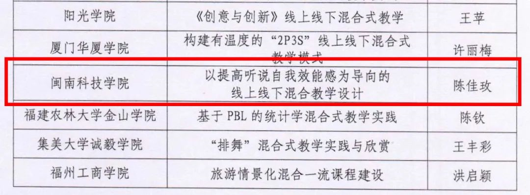 近日,福建省2023年度“慕课十年典型案例”获奖名单公布,我校教师陈佳玫的教学案例《以提高听说自我效能感为导向的线上线下混合教学设计》荣获二等奖。