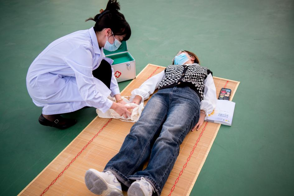 医疗救护组对受伤学生进行清创包扎