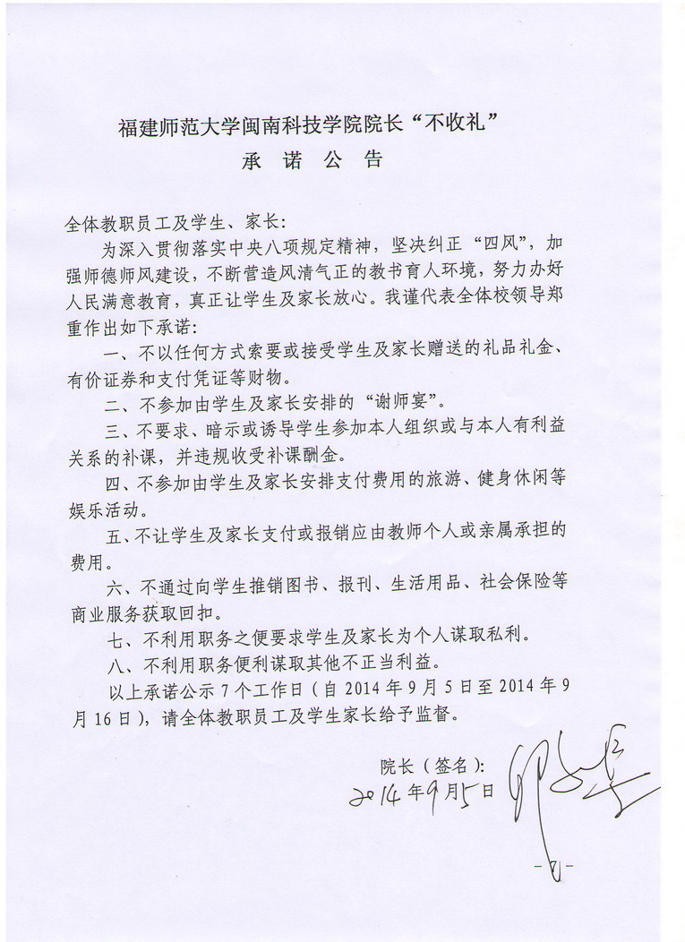 福建师范大学开云电子登录_开云(中国)院长“不收礼”承诺公告